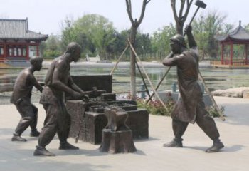 該民俗雕塑以銅雕為載體,傳承傳統雕塑工藝。創作者聚焦 “河口碼頭” 場景,刻畫三位勞動者搬運貨物的動態:有的背負糧袋爬坡、有的合力抬箱、有的借力起運,通過寫實造型與力量感姿態,還原舊時碼頭勞作風貌。從文化意義看,它是地域歷史的微縮呈現。碼頭曾是商貿、交通樞紐,勞動者群像見證往昔貨運興衰,承載當地百姓對勤勞、協作精神的推崇;銅雕材質賦予作品持久生命力,讓后代能觸摸先輩奮斗軌跡,延續對傳統行業、勞動價值的文化記憶,成為連接過去與當下的民俗文化紐帶,喚起人們對地域發展歷程與勞動精神的共情。